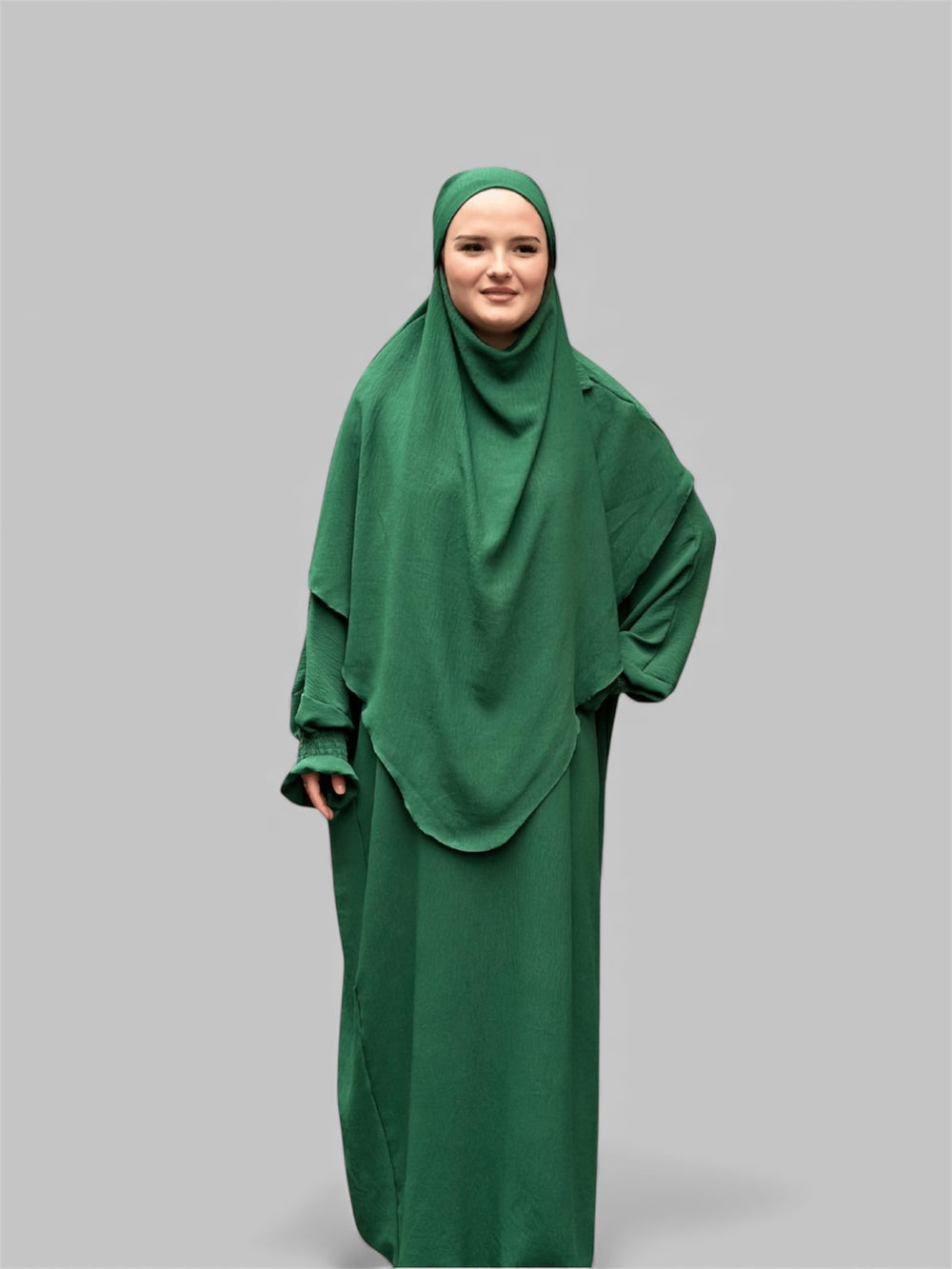 The Abaya Khimar Two-Piece combines classic modesty with modern style, crafted from high-quality, flowing fabric. This ensemble offers both comfort and a noble appearance, perfect for special occasions or stylish everyday wear.