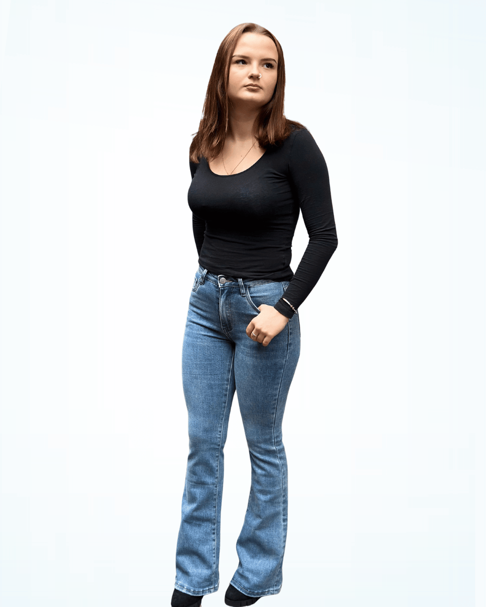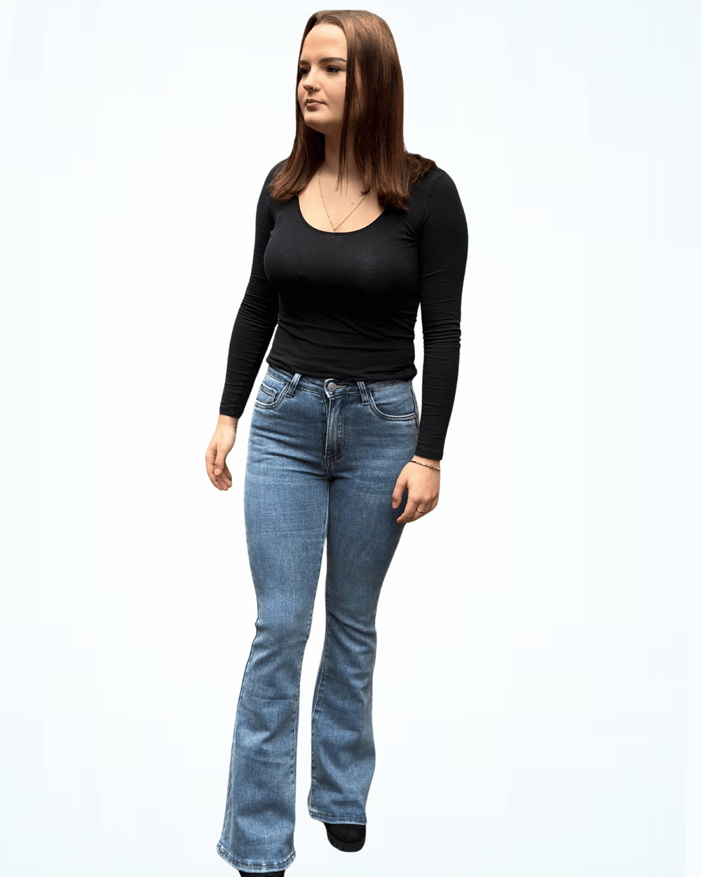 The "Luna" Flared Jeans in classic blue are a true must-have for combining vintage vibes with modern chic. The high waist creates a beautiful, elegant silhouette that accentuates the waist. The flared leg provides a casual retro look that pairs perfectly with both sneakers and heels.