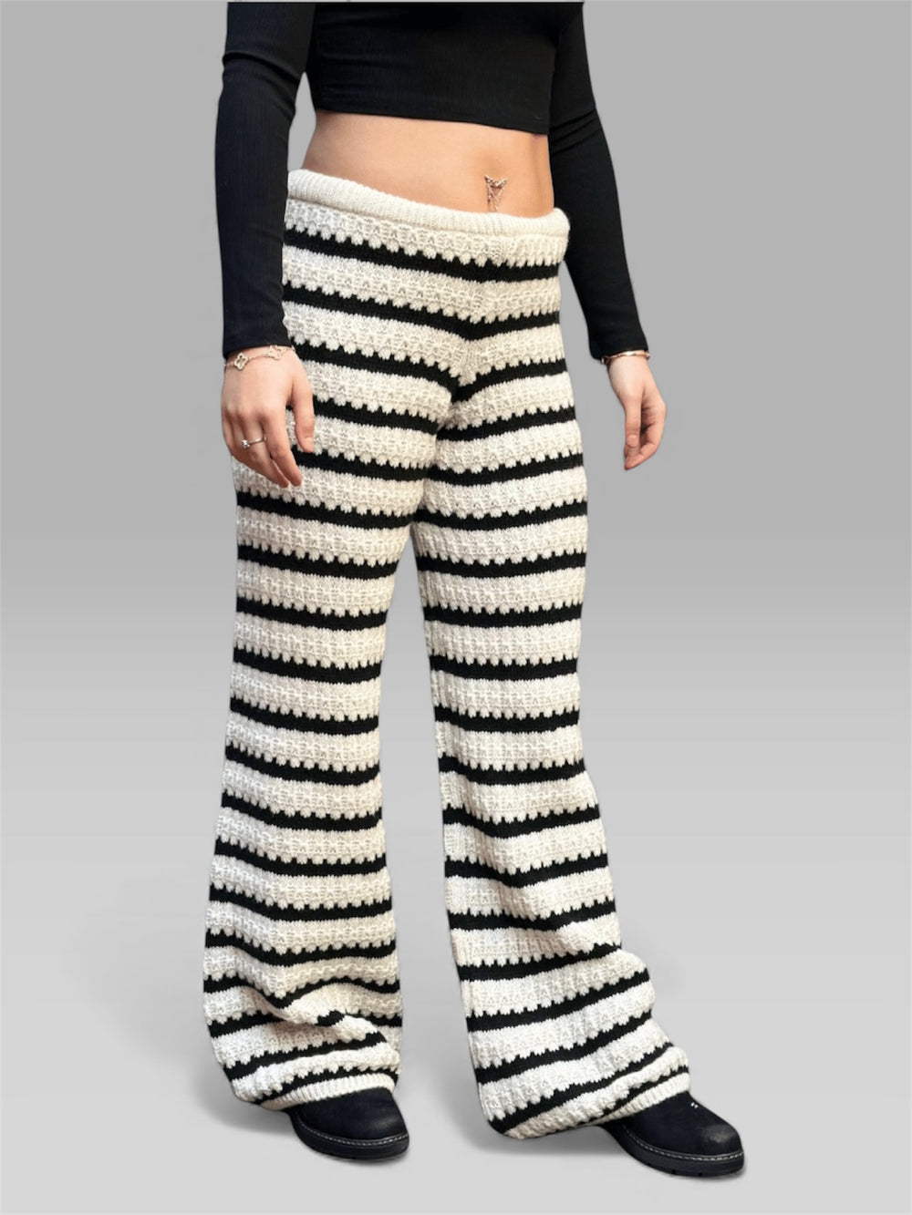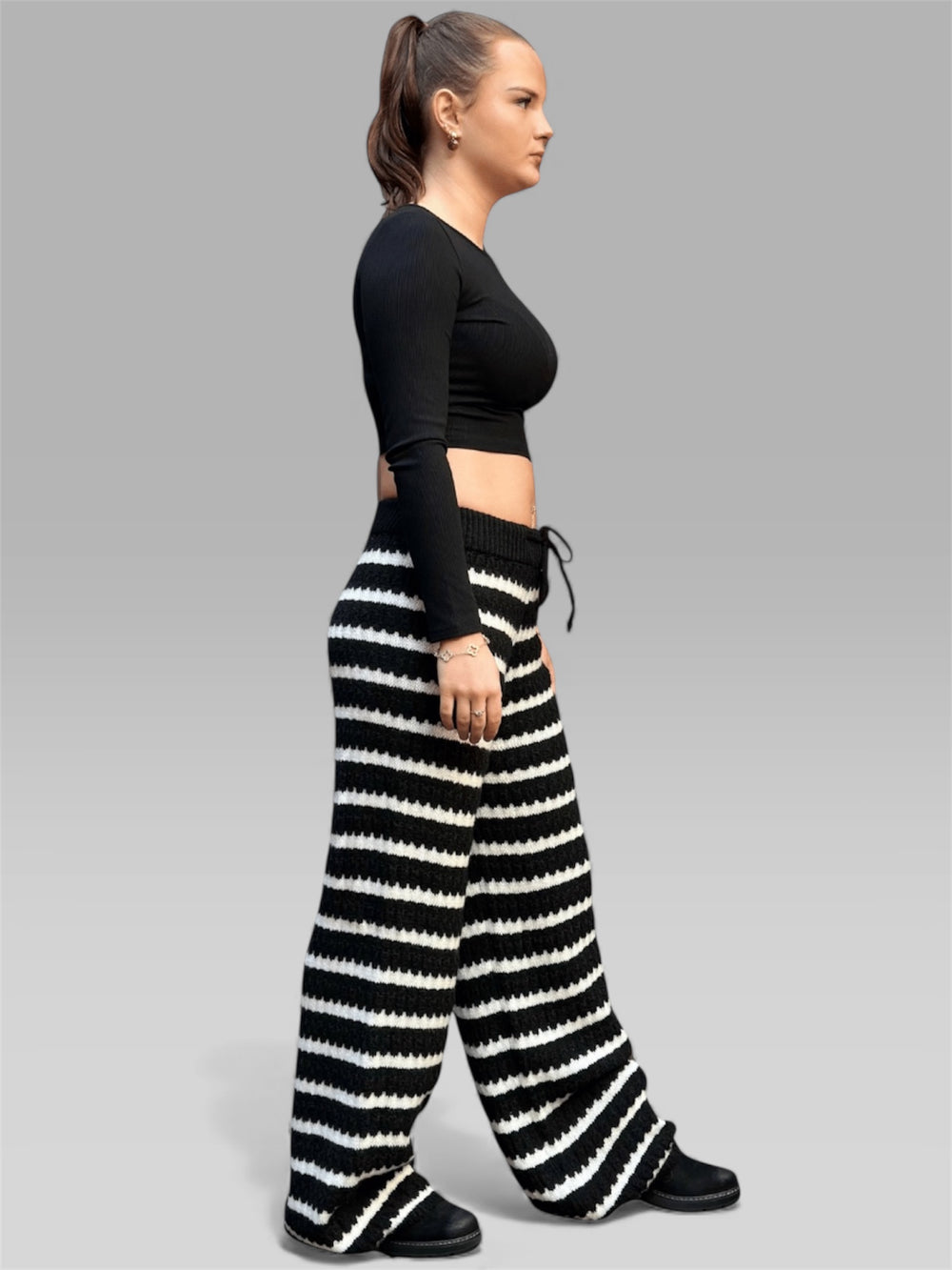 Die Hose „Elisa“ ist Ausdruck von Selbstbewusstsein und Stil. Mit ihrem markanten schwarz-weißen Streifenmuster und dem weiten Beinausschnitt verleiht sie jedem Look Bewegung und Dynamik. Die hohe Taille betont die Figur und sorgt für eine schmeichelhafte Silhouette, während der fließende Stoff für Komfort und Eleganz sorgt.