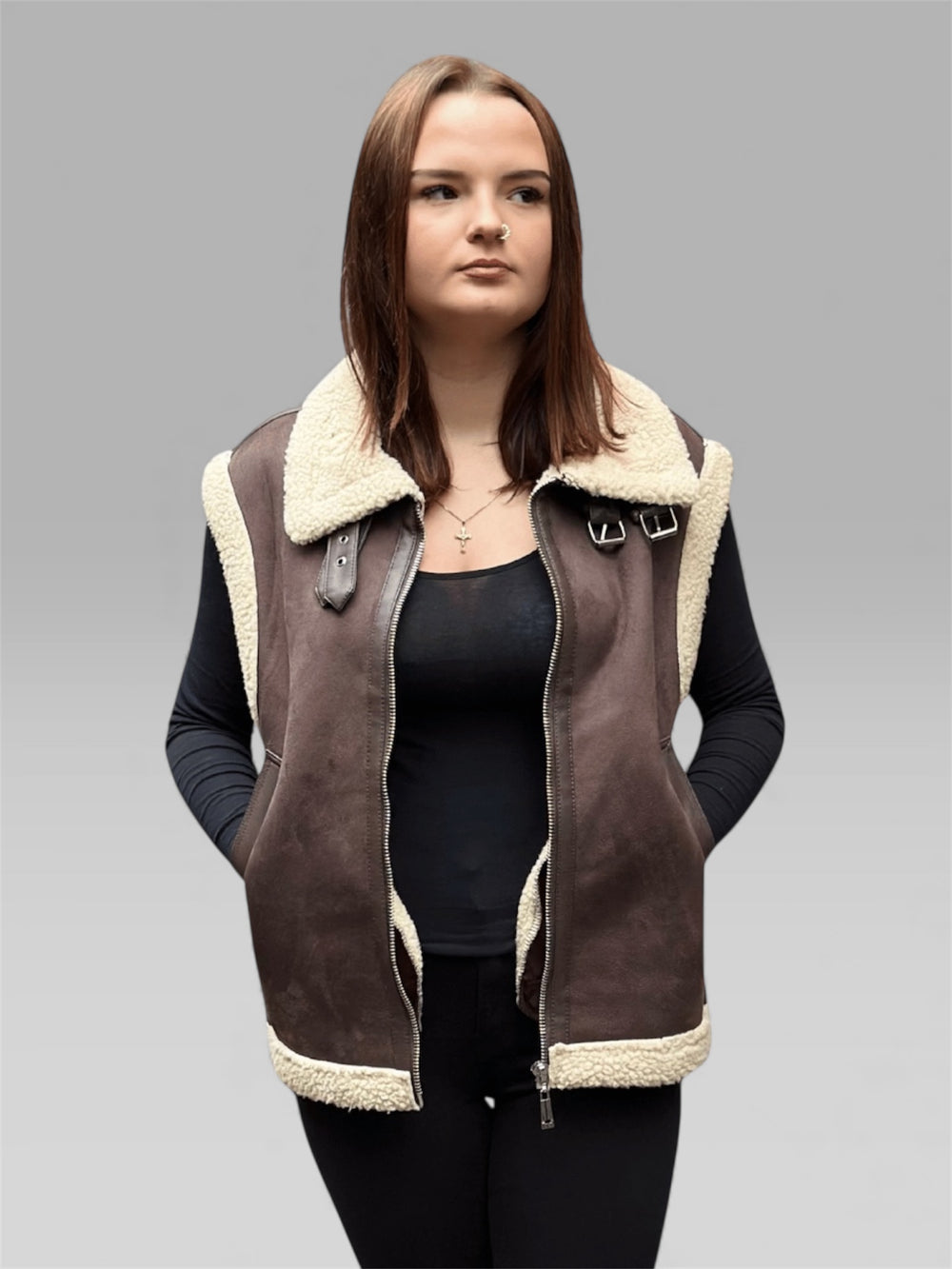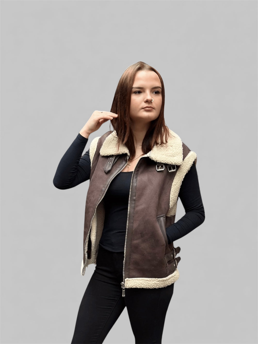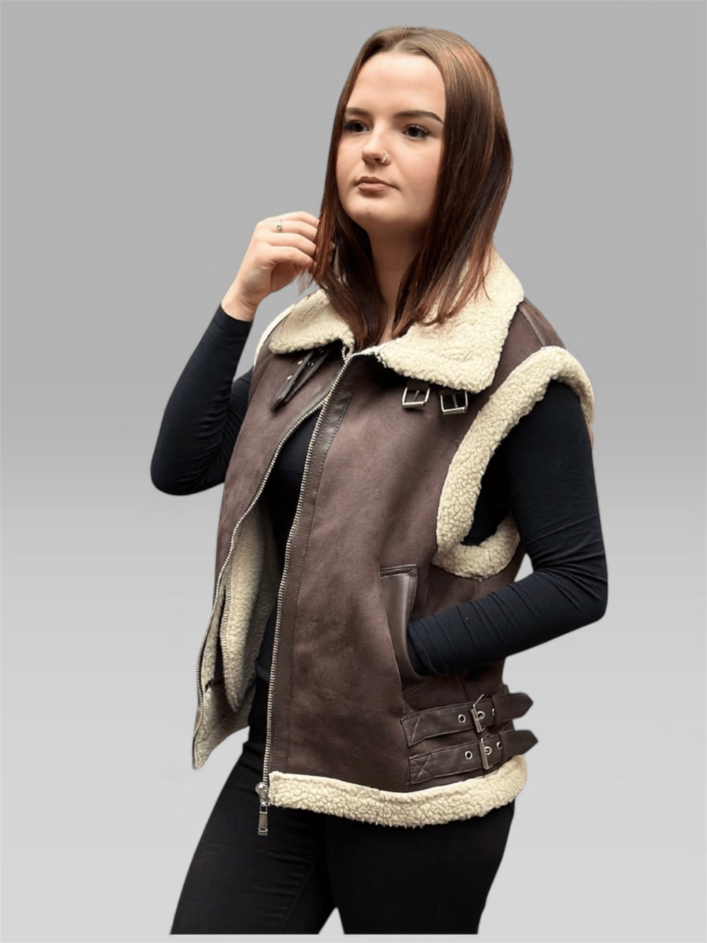 Die Weste „Maya“ verbindet rustikalen Charme mit moderner Eleganz . Sie besticht durch ihre hochwertige Wildlederoptik und das kuschelige Innenfutter für wohlige Wärme. Das ärmellose Design macht sie zum perfekten Lagenlook für die Übergangszeit und lässt sich einfach über Pullover, Langarmshirts oder Kleider ziehen.