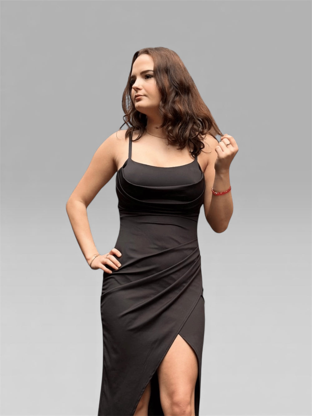 Kombinieren Sie das Kleid mit schwarzen Heels und minimalistischen Accessoires für einen modernen, eleganten Look. Ein roter Lippenstift rundet das Outfit glamourös ab.